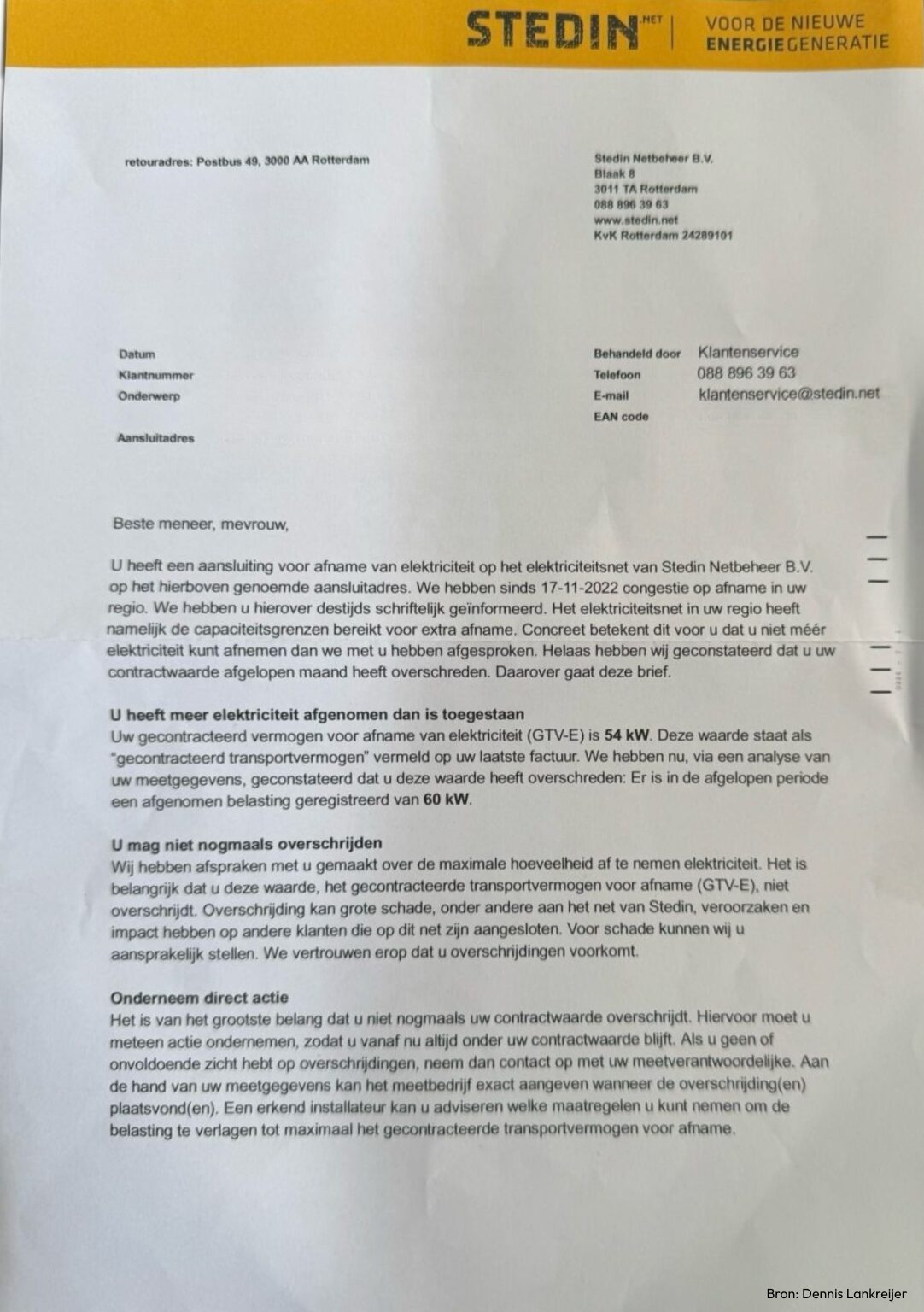 Een voorbeeld brief van Stedin hieronder waardoor een ondernemer in actie schoot.